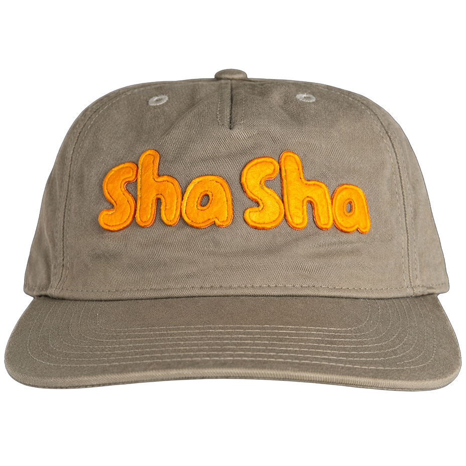 The new 2026 Sha Sha hat is here! It's an Olive dad hat with leather strap and metal buckle. The "Sha Sha" is Mustard yellow felt, sewn on with green thread.